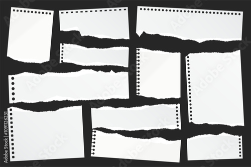 Ripped paper strips. Realistic crumpled paper scraps with torn edges. Shreds of notebook, book or old newspaper pages. Trendy collage elements. Vector illustration