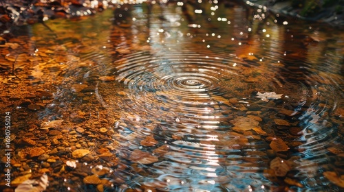 Ripples expanding in shallow water with fallen leaves and pebbles on the bottom of the stream bed