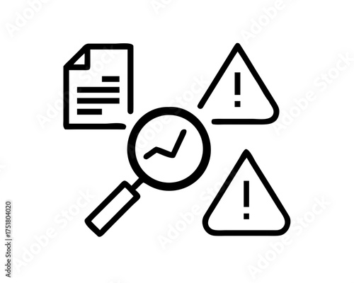 risk, analysis, warning, signs, alert, hazard, danger, magnifier, glasses, document, report, assessment, evaluation, identification, management, control, prevention, safety, security, protection, business, finance, inspecting, compliance, regulation, policy, procedure, process, system, plan