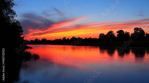 sunset, river, sky, tree, nature, landscape, water, colourful, dusk, evening, cloud, panorama, background, scene, beauty, peaceful, serenity, tranquil, calm, colours, orange, red, blue, yellow, light, horizon, summer, image, photo, picture, view, scenery, rural, majestic, awesome, marvellously, stunning, gorgeous, breathtaking, amazing