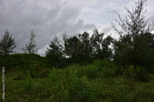 Riverbank afforestation with casuarina and coconut trees along Bakkhali River, Cox’s Bazar Bangladesh – climate resilience and green conservation landscape