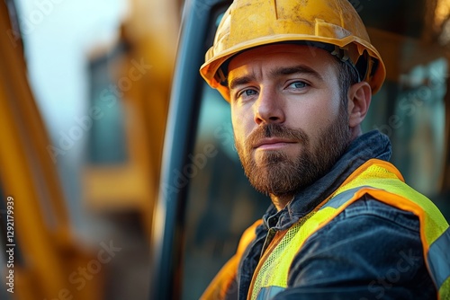 Road construction worker in safety gear focuses intently on his task during morning hours at a construction site amidst heavy machinery, emphasizing dedication and professionalism