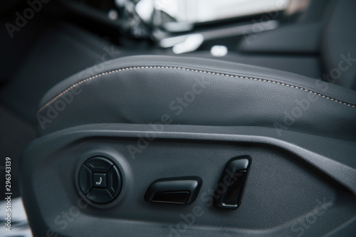 Road safety. Close up view of interior of brand new modern luxury automobile