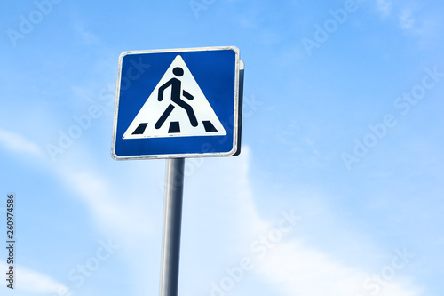 Road sign - Pedestrian crossing. Square blue and white metal plate with white stripes and a walking man. Blue sky background.