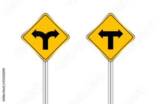 road sign black arrow pointing left and right, traffic road sign yellow isolated on white, yellow traffic sign for left and right, warning caution sign and steel pole for direction signpost the way