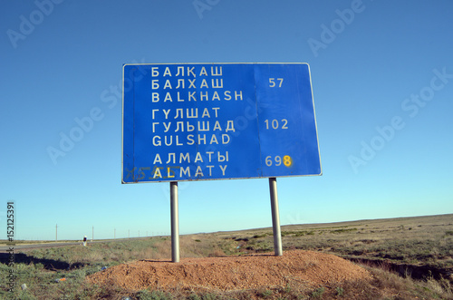 Road sign.Area of former Soviet anti-ballistic missile testing range Sary Shagan .Kazakhstan.May 6, 2017.Sary Shagan.Kazakhstan