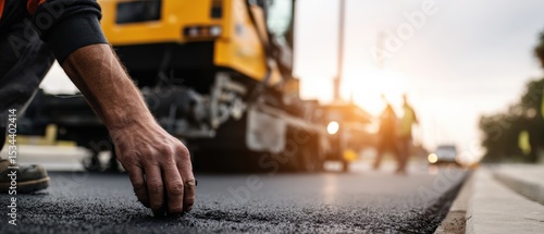Road worker smoothing asphalt with hand during road construction at sunset Concept of infrastructure, manual labor, and roadworks