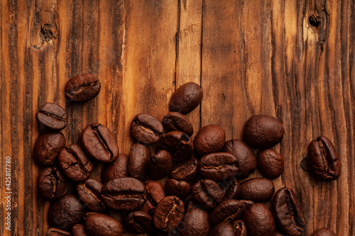 Roasted coffee beans on the old dark wooden background for wallpaper or decor