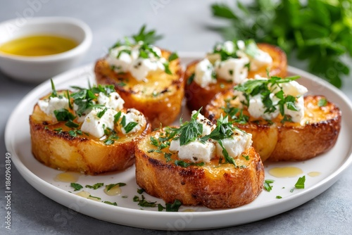 feta, parsley, olive oil, tapas, finger food, snack, bruschetta, crostini, side dish, potato, health food, epicure, culinary, cooking, meal, eating, food photography, eatery, cafes, menu, delicious, tasty, savoury, fresh, homemade, catering, party, gathering, event, white plate, grey background, closeup, nobody, studio shot, comfort food, vegetarian, organic, natural, simple, rustic, crispy, golden brown, garnish
