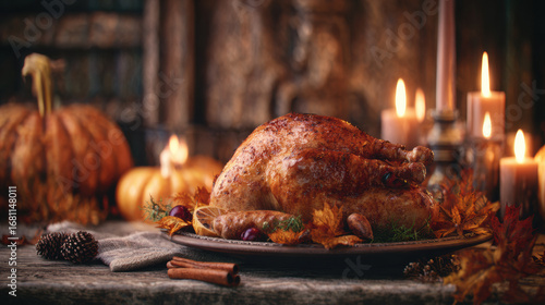 Roasted Thanksgiving Turkey with Autumn Leaves and Candles