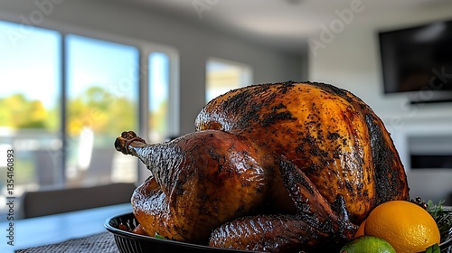 Roasted turkey on table in modern home.