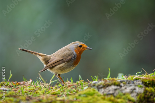 Robin resting on the ground. Close-up view. Blur background