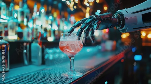 robot, hand, arm, drink, cocktail, glasses, ice, bar, futuristic, technology, metal, shiny, beverage, liquid, alcohol, nightlife, bokeh, light, blurred, background, dark, chrome, service, machine, barkeeper, future, urban, modern, neon, cold, chilled, transparent, pink, wine glass, robotic, serving, digital, innovation, science, engineering, mixing, artificial