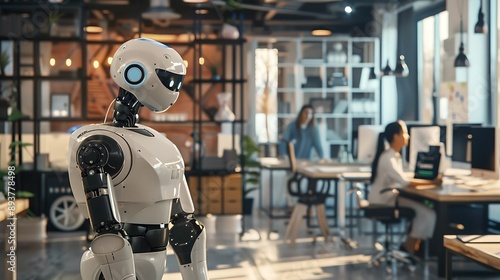 robot, android, office, technology, future, artificial, intelligence, ai, automation, machine, computer, workplace, business, innovation, modern, futuristic, cybernetic, robotic, cyborg, android, digital, science, engineering, electronic, hardware, software, white, metal, plastic, glasses, light, shadow, desk, chair, window, building, interior, person, woman, men at work, employee, team, collaboration, interaction, concept, progress