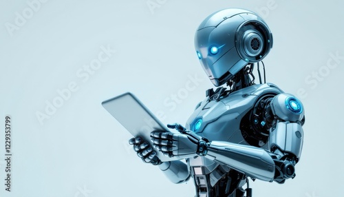 robot, using, tablet, futuristic, android, screen, artificial, intelligence, machine, automation, technology, cyborg, digital, device, electronic, display, working, research, development, innovation, communication, connection, datum, information, analysis, processing, system, interface, software, robotic, character, metal