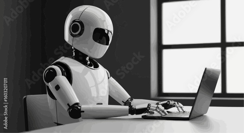 robot, three-dimensional, technology, android, computer, cyborg, business, machine, laptop, cartoon, character, futuristic, toy, future, people, render, person