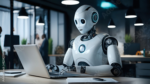 robot working in the office close up. team working on laptop in the office. artificial intelligence. AI generated