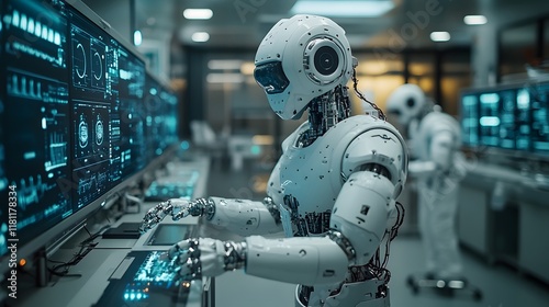 Robotic arms performing delicate surgery in a high-tech medical facility, surrounded by monitors and data visuals