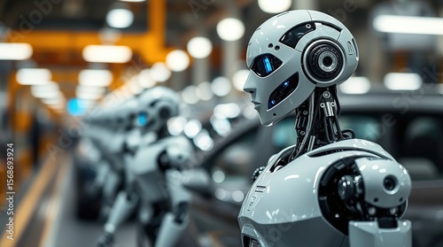robot, automation, factory, assembly line, manufacturing, technology, artificial intelligence, ai, robotic, machine, industry, industrial, future, futuristic, engineering, production, process, automated, system, car, vehicle, transportation, bokeh, blurred background, depth of field, precision, innovation, modern, advanced, digital, cyborg, android, mechanized, metal, steel, chrome, white, clean, efficient, work, workplace, job, labor, scale, perspective, row, sequence
