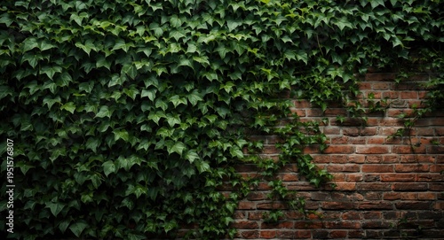 Robust green ivy spreading over old brick facade with traditional style background