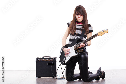 guitar, teenage, woman, playing, music, musician, female, isolated, smiling, people, sensuality, cheerful, smiley face, happiness, laughing, beautiful, portrait, beauty, fun, youth culture, adult, human hair, young adult, glamour, lifestyle, studio shot, string instrument, entertainment, brunette, musical instrument