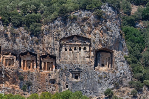 Rock cut tombs, ancient architecture carved into a cliff face, show intricate details. The tombs stand in a row, surrounded by rugged rock and greenery, under a blue sky - Caunos Tombs of the Kings