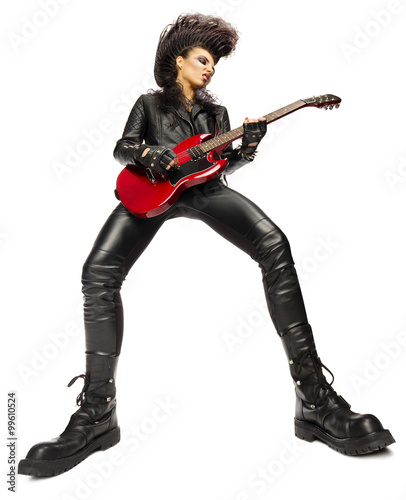 mohawk, coiffure, ethnicity, punk, music, rock, musician, caucasian, woman, leather, adult, black, fashion, young, beautiful, people, jacket, hair, holding, clothing, heavy, 1, guitar, performer, metal, human, model, playing, modern, entertainment, standing, person, grunge, popular, electric, sound, boot, female, instrument, isolated, electric, girl, glove, singer, artist, star, bizarre, terrible, anger