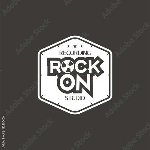 Rock on. Recording studio label, badge, emblem logo with musical instrument. Stock illustration isolated on dark background