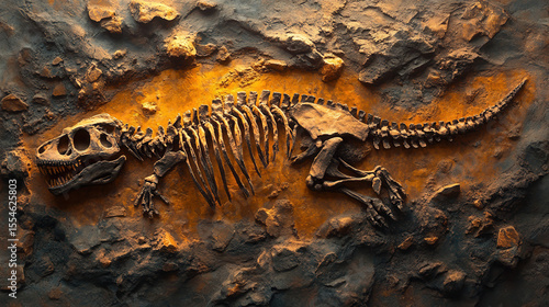rocky wall with fossilized dinosaur bones, realistic textures and lighting, ancient discovery, museum display