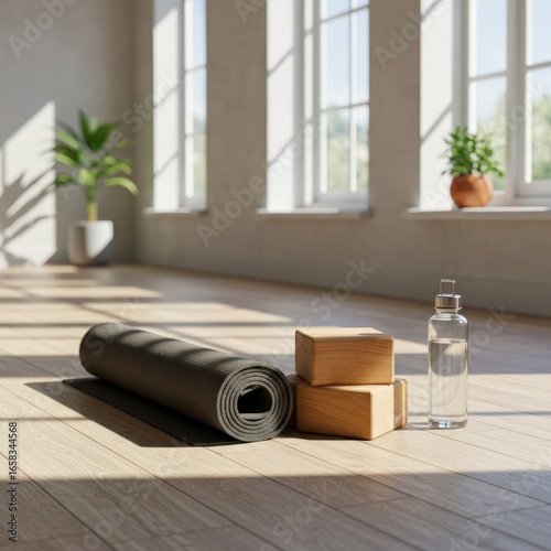 Rolled yoga mat with water bottle setup for workout. Fitness and wellness lifestyle concept.