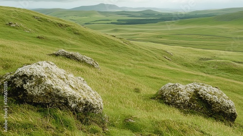 landscape, hill, green, grass, rock, vale, meadow, nature, scenic, view, rolling, boulder, smooth, vegetation, rural, field, natural, light, misty, distant, horizon, elevation, contour, gentle, slope, texture, wildlife, organic, open, calm, still, huge, wide, panoramic, fresh, lush, grassy