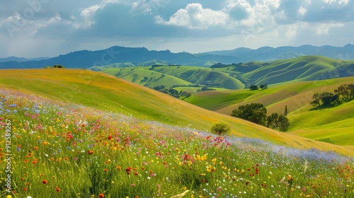 Rolling hills adorned with blankets of wildflowers, painting the countryside in a kaleidoscope of colors under the warm spring