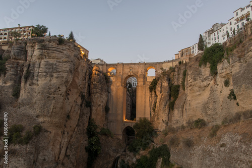 spain, andalusia, ronda, europa, old, night, rock, canyon, landmark, bridge, cliff, tour tourism, travel, destination, evening, roman, mount, illuminated, dusk, european, málaga