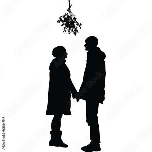 couple, holding hands, mistletoe, winter, romance, love, holiday, christmas, seasonal, celebration, affection, togetherness, romantic, winter scene, snow, night, illustration, vector, design, art, graphic, icon, symbol, decoration, greeting card, invitation, scrapbooking, digital artwork, clip art, drawing, painting, vintage, retro, traditional, festive, joyful, happy, warmth, intimate, hugs, kiss, hug, white background