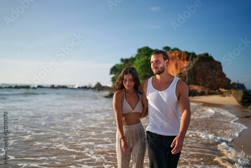 Romantic couple walks on beach at sunset. Newlyweds enjoy honeymoon by sea. Man and woman in love, holding hands near ocean. Casual summer attire, relaxing, strolling sandy shore. Tourism, leisure.
