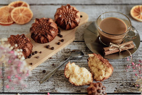 Romantic delicious and beautiful breakfast latte coffee and homemade muffins on wooden background