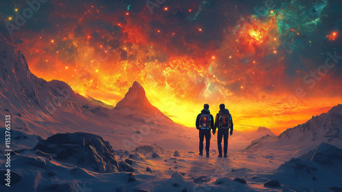 Romantic digital art painting of a couple in space at sunrise with a cosmic love theme