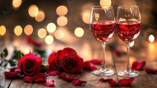 Romantic evening for two. Two glasses of red wine and red roses on wooden table with warm bokeh lights. Valentine's Day celebration.