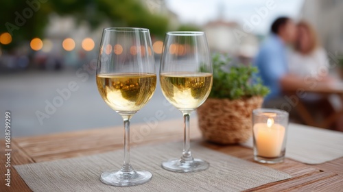Romantic Evening with Wine: Two glasses of exquisite white wine on a charming table, as the warmth of a candle casts a golden glow, with a couple sharing an intimate moment in the blurry background.