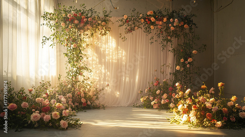 Romantic floral wedding backdrop with soft pink and peach roses, lush greenery, and warm sunlight casting gentle shadows on sheer white curtains, creating elegant and serene atmosphere