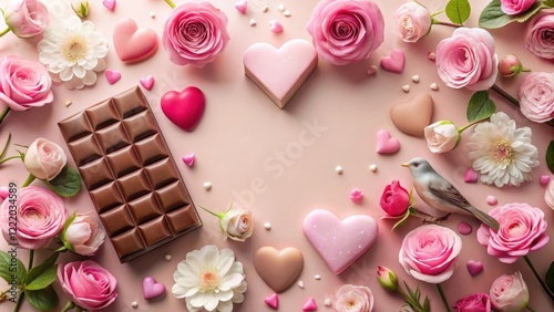 Romantic pastel pink floral arrangement with chocolate bar and heart shaped candies