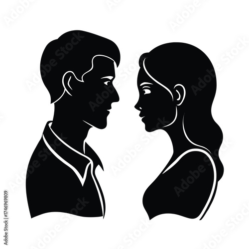 silhouette, couple, man, woman, profile, facing, love, romance, human relationships, connection, intimacy, black, and, white, icon, symbol, art, illustration, drawing, graphic, design, head shot, face, male, female, together, pair, romantic, elegant, simple, minimalist, contrast, outline, lover, affection, portrait, vintage, retro, artistic