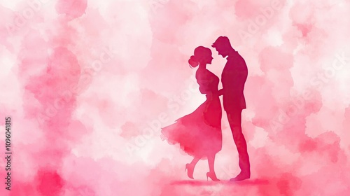 Romantic silhouette of couple in pink watercolor background for valentine's day