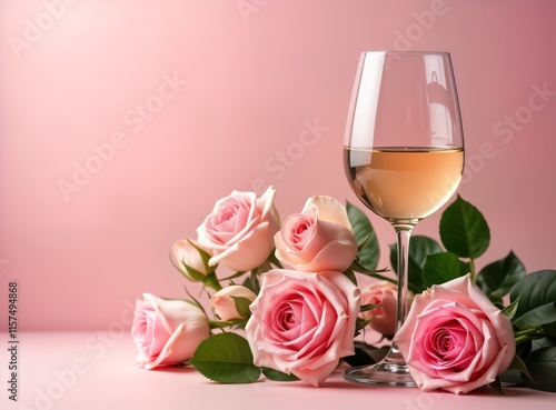 Romantic still life featuring bouquet of delicate pink roses on soft pink background, glass of white wine. Beautiful floral design, perfect for Valentines Day. Simple yet elegant composition ideal