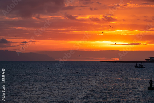 Romantic sunset seen from lookout Cypelek Los Cristianos, Tenerife, Canary Islands, Spain, Europe. Silhouette of birds entering frame. Fishermen boat on the way to Island of La Gomera in the distance