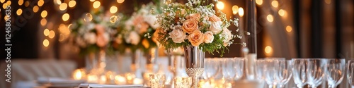 Romantic Wedding Reception: Elegant peach and ivory floral centerpieces take center stage at a beautifully decorated wedding reception, illuminated by warm candlelight and fairy lights.