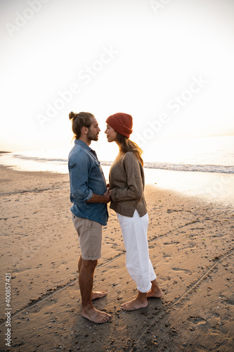 romantic, young, couple, looking, holding, hand, standing, shore, sunset, copy space, people, adult, woman, man, holland, outdoors, atmosphere, leisure, casual attire, sunlight, girlfriend, boyfriend, intimacy, woolly, hat, cap, bun, affection, sensuality, male, female, beach, caucasian, bonding, lifestyle, nature, enjoyment, weekend, clear, sky, romance, love, falling, emotion, waterside