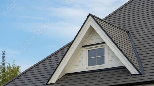 roof, attic, window, shingle, grey, dark, triangular, white, trim, architecture, house, building, exterior, design, construction, roofing, material, sky, blue, cloud, residential, home, property, real, estate, dwelling, structure, detail, closeup, view, angle, perspective, photo, image, picture, nature, environment, surrounding, area, neighbourhood, community, urban, landscape