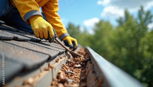 roofer, roof, cleaning, gutter, construction, site, home, maintenance, tool, glove, yellow, detail, sharpened, sky, cloud, tree, background, debris, removal, house, building, repair, renovation, exterior, work, men at work, job, professional, safety, seasonal, spring, autumn, fall, weather, protection, water, drainage, dirt, leaf, twig, branch, woodchips, residential, commercial