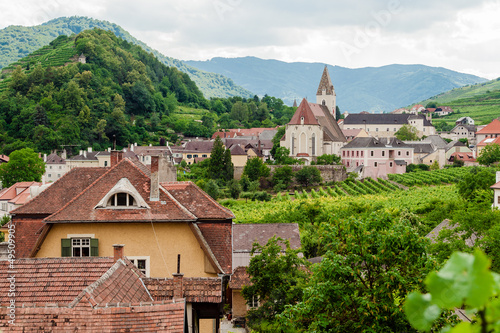 agriculture, architecture, arrangement, austria, horizontal, botany, building, catholic, central, church, crop, cultivate, cultivation, europa, exterior, farming, flora, forest, grow, growing, heritage, hill, house, industry, landscape, lower, mountain, nature, plant, red, roof, row, sky, church steeple, summer, tile, tower, town, travel, unesco, vine, vinery, danube, vale, wine, spitz, tree